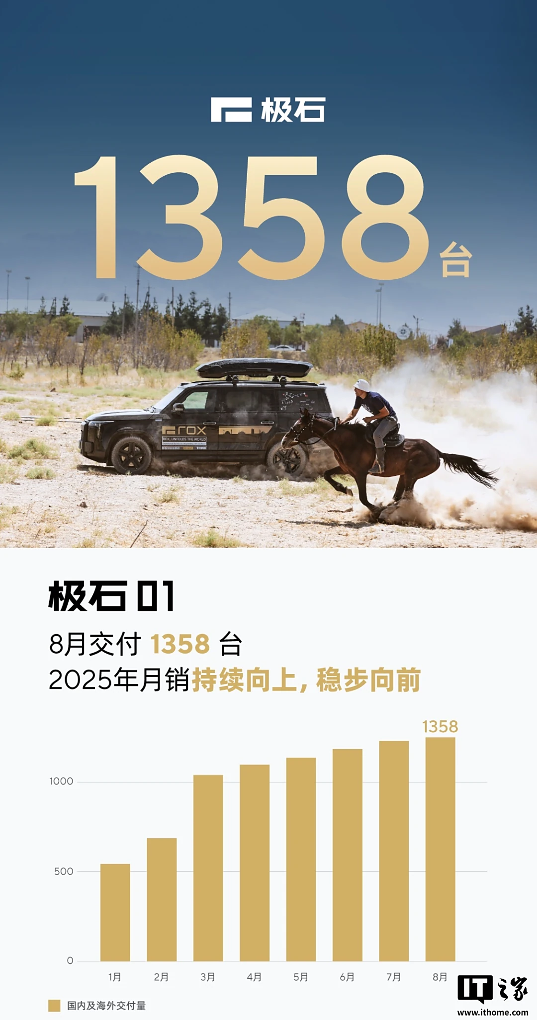 IT之家 8 月 31 日消息,极石汽车今日披露消息:极石 01 汽车 8 月交付 1358 台,2025 年月销持续向上,稳步向前。