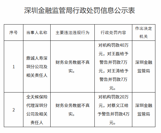 近日,深圳金融监管局发布一则行政处罚信息公示表,鼎诚人寿深圳分公司因财务业务数据不真实被罚。公示表显示,鼎诚人寿深圳分公司被罚40万元,相关责任人王磊、王涛分别被给予警告并罚款7万元。