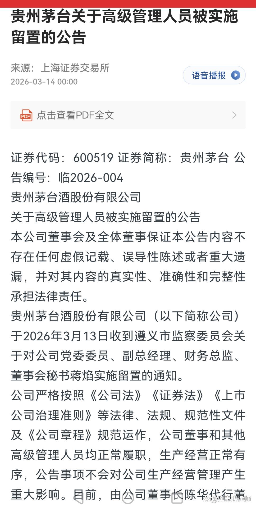 “贵州茅台酒股份有限公司(以下简称公司)于2026年3月13日收到遵义市监察委员会关于对公司党委委员、副总经理、财务总监、董事会秘书蒋焰实施留置的通知。公司严格按照《公司法》《证券法》《上市公司治理准则》等法律、法规、规范性文件及《公司章程》规范运作,公司董事和其他高级管理人员均正常履职,生产经营正常有序,公告事项不会对公司生产经营管理产生重大影响。目前,由公司董事长陈华代行董事会秘书职责。”
